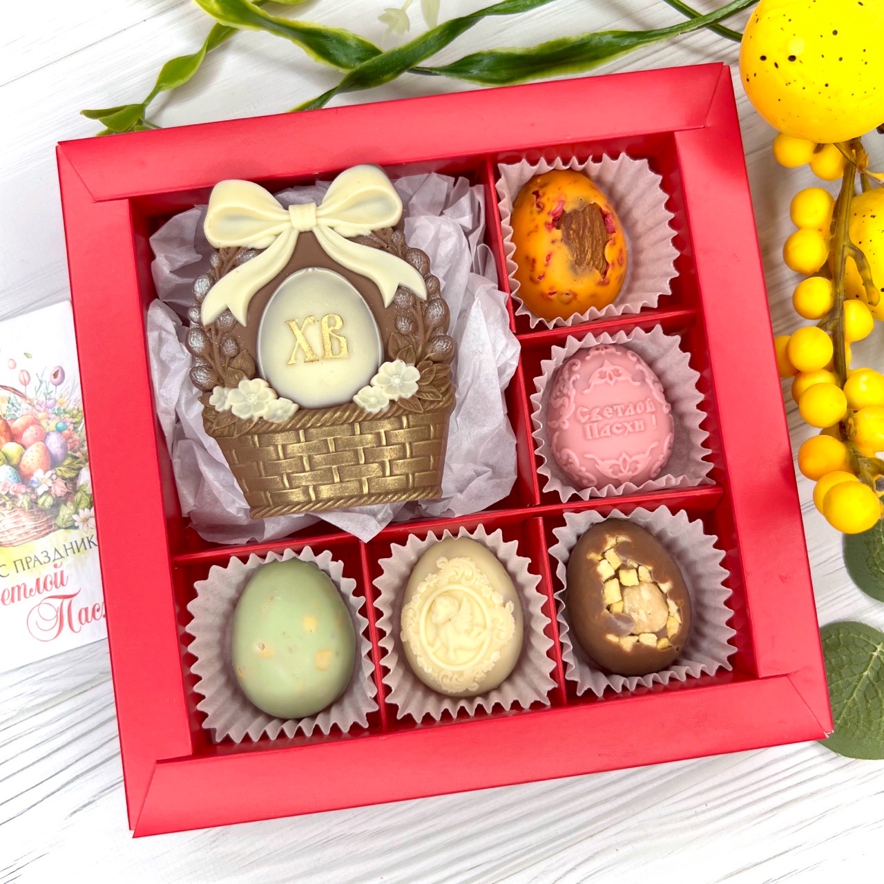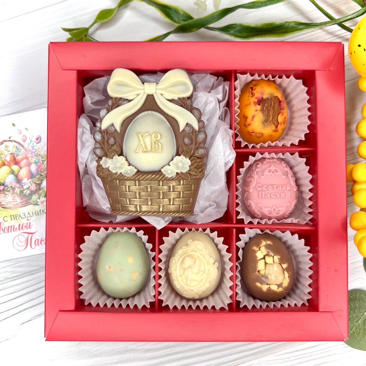 Шоколадный набор "Пасхальная корзина": шоколадка и 5 конфет ручной работы - вкусный и оригинальный подарок на Светлый Праздник Пасхи.
