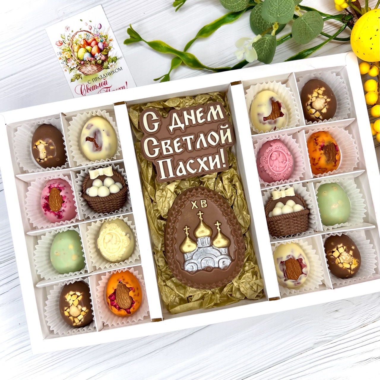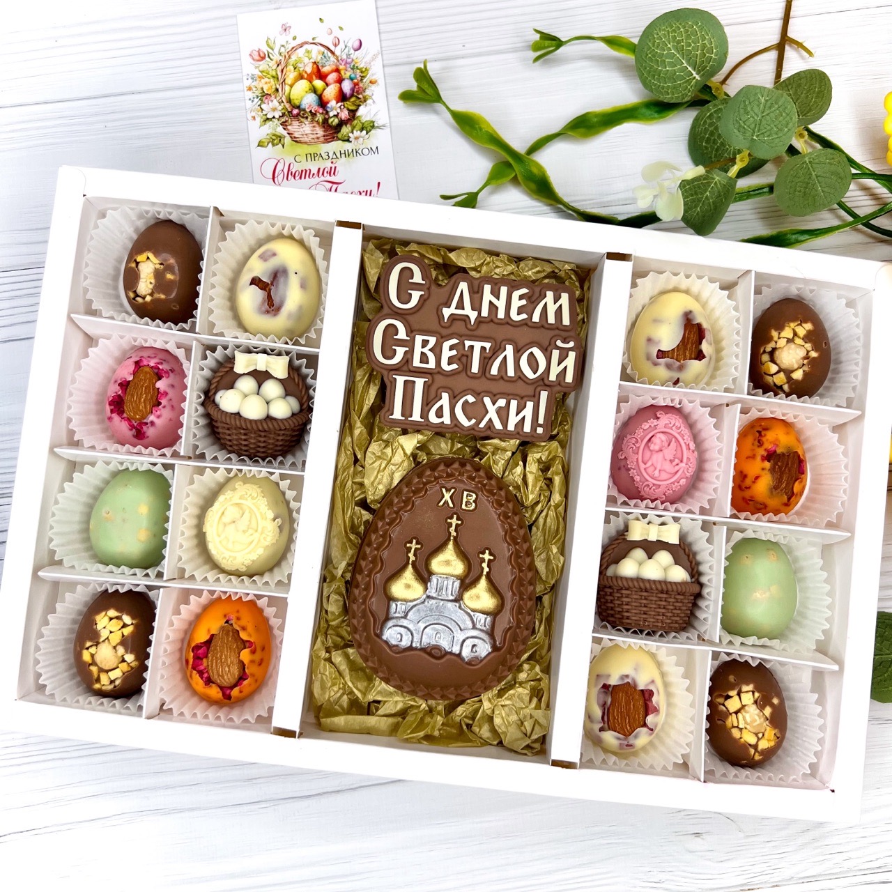 Шоколадный набор "С Днем Светлой Пасхи. Храм": 2 шоколадки и 16 конфет ручной работы - вкусный и оригинальный подарок на Светлый Праздник Пасхи.