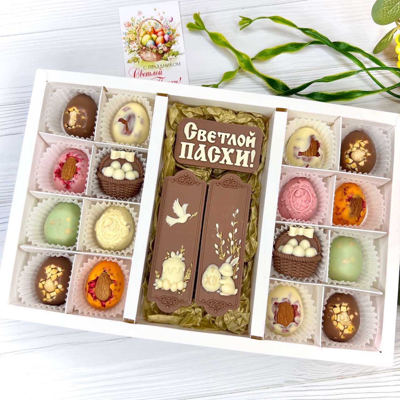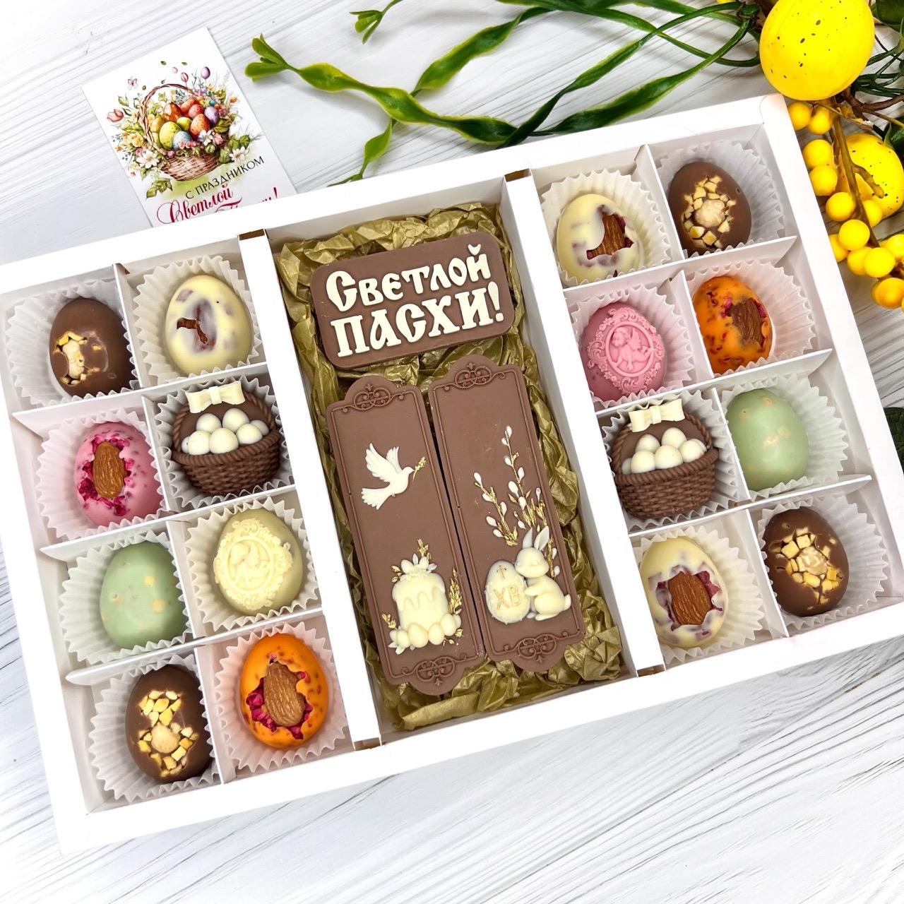 Шоколадный набор "Светлой Пасхи": 3 шоколадки и 16 конфет ручной работы - вкусный и оригинальный подарок на Светлый Праздник Пасхи.