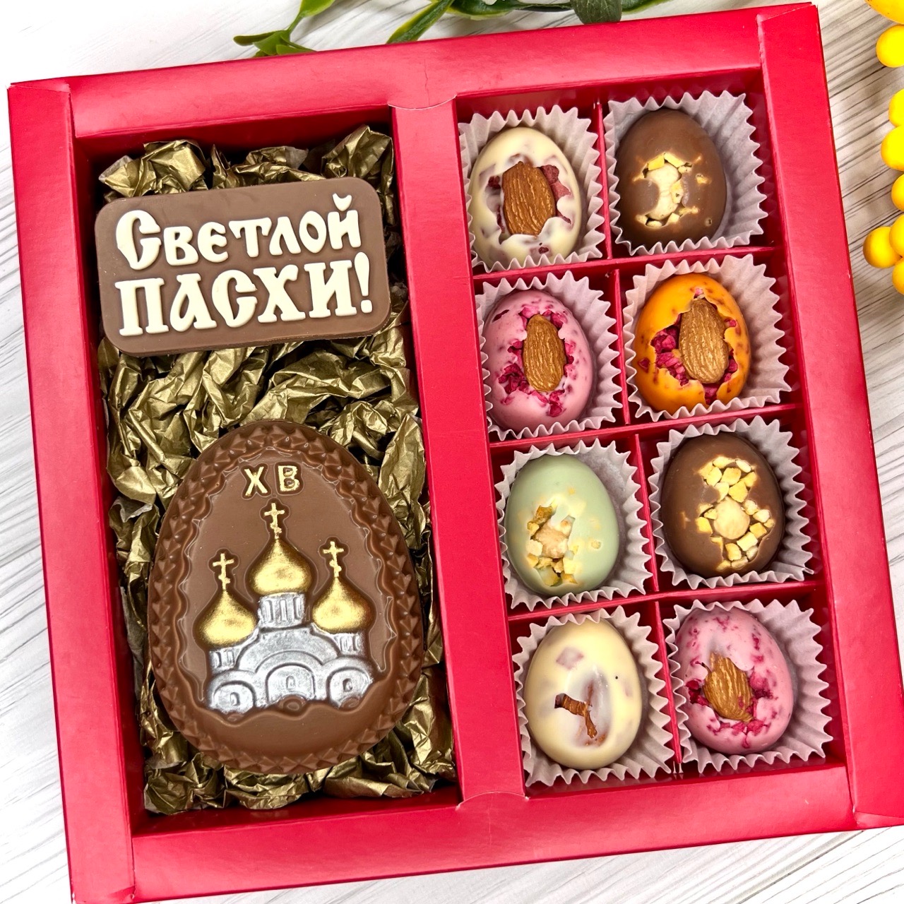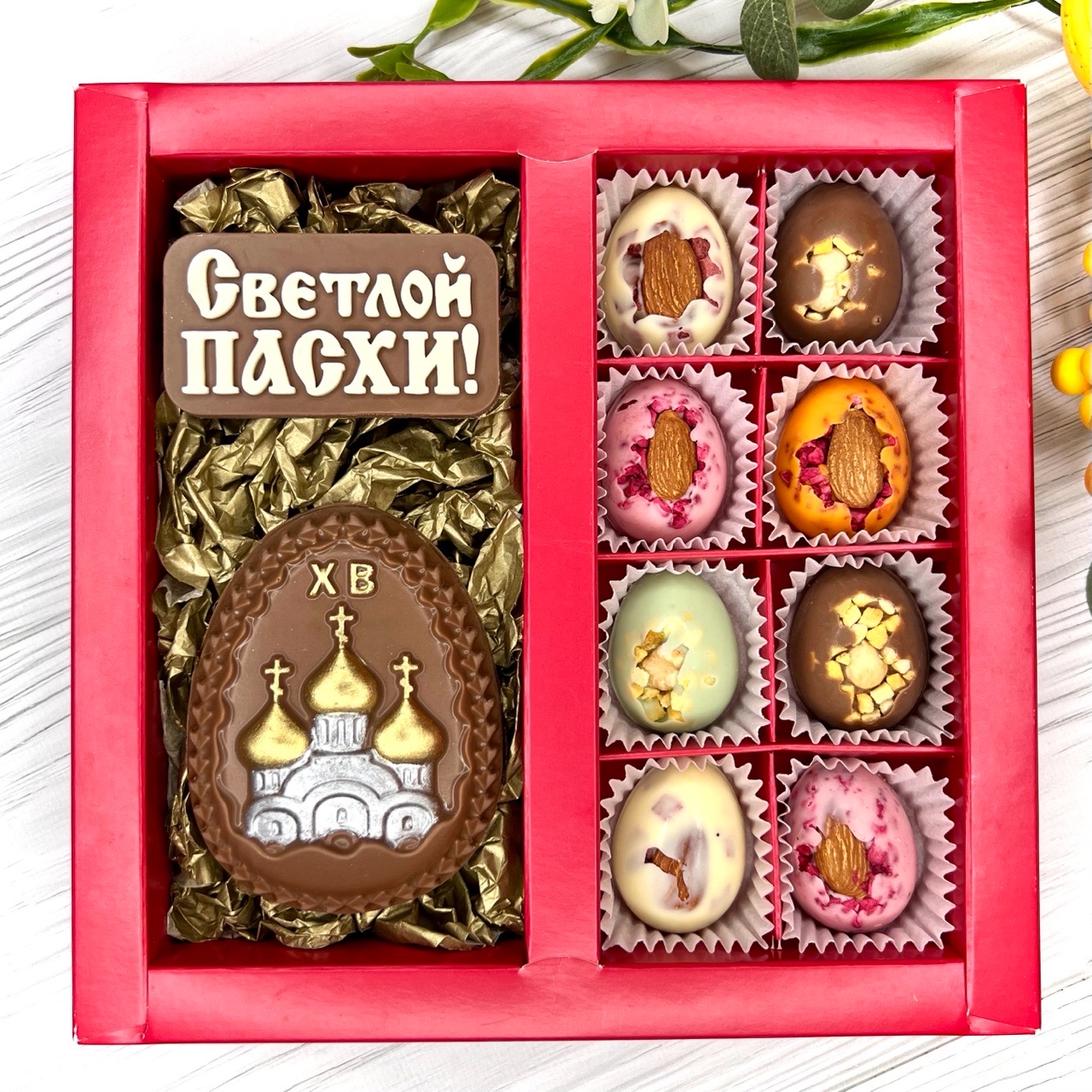 Шоколадный набор "Светлой Пасхи. Храм": 2 шоколадки и 8 конфет ручной работы- вкусный и оригинальный подарок на Светлый Праздник Пасхи.