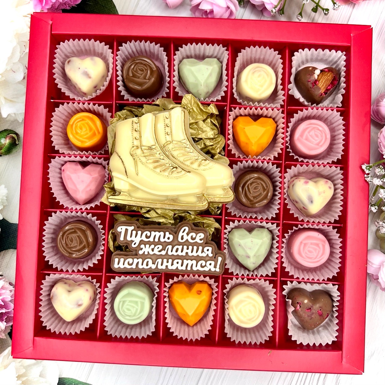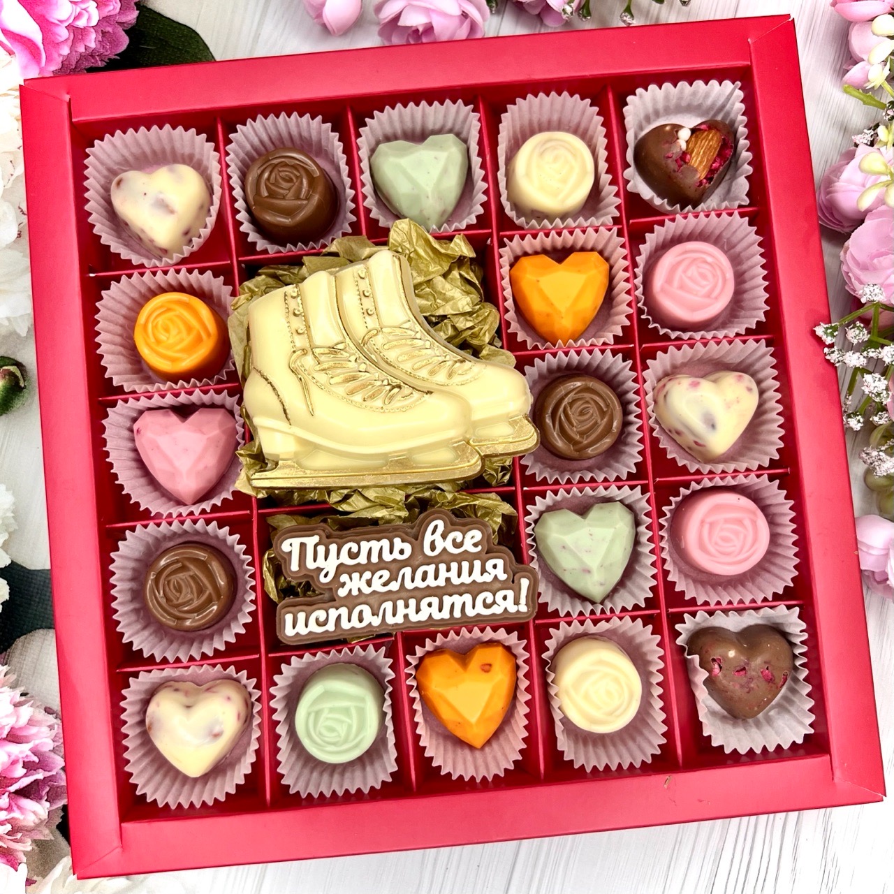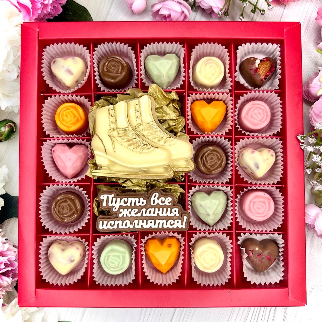 Шоколадный набор "Фигурные коньки. Пусть все желания исполняться": шоколадка и 19 конфет ручной работы - оригинальный, достойный и поистине вкусный подарок тренеру.