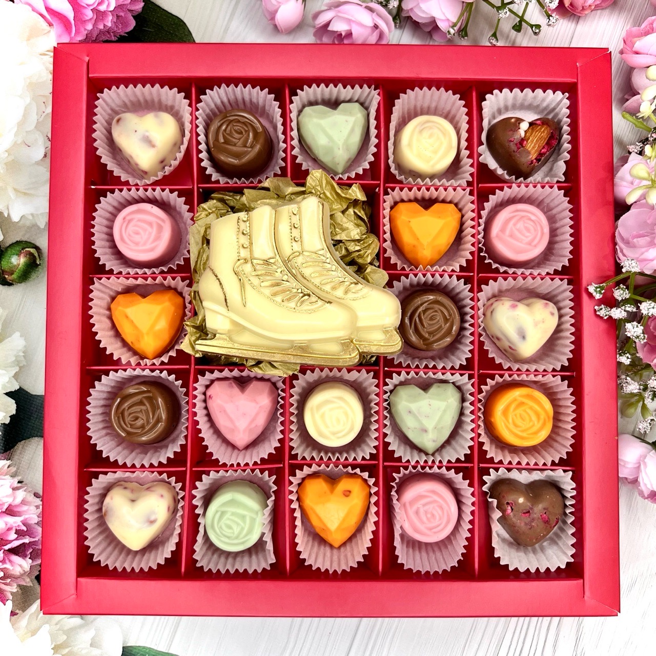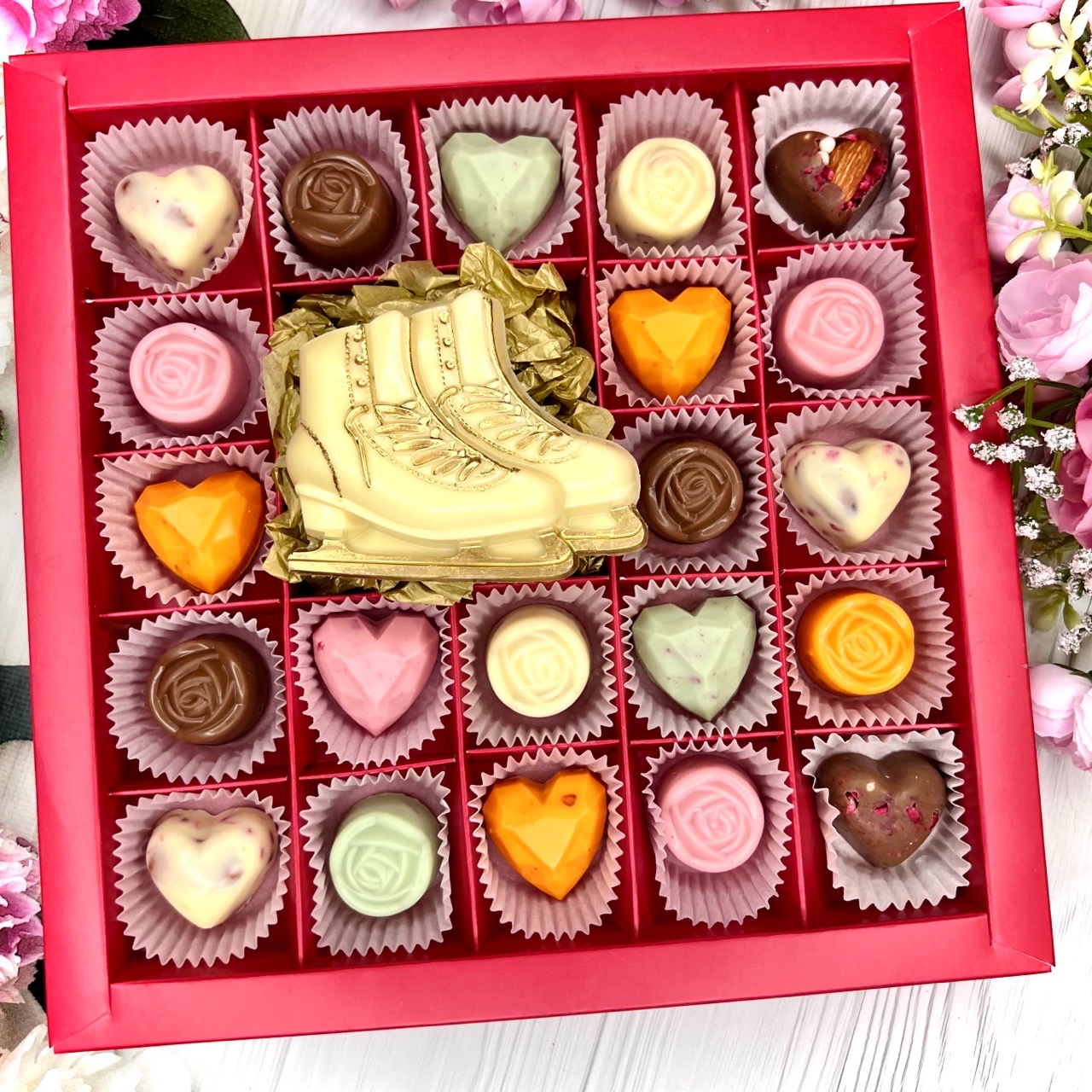 Шоколадный набор "Женские фигурные коньки": шоколадка и 21 конфета ручной работы- оригинальный, достойный и поистине вкусный подарок тренеру или фигуристке.