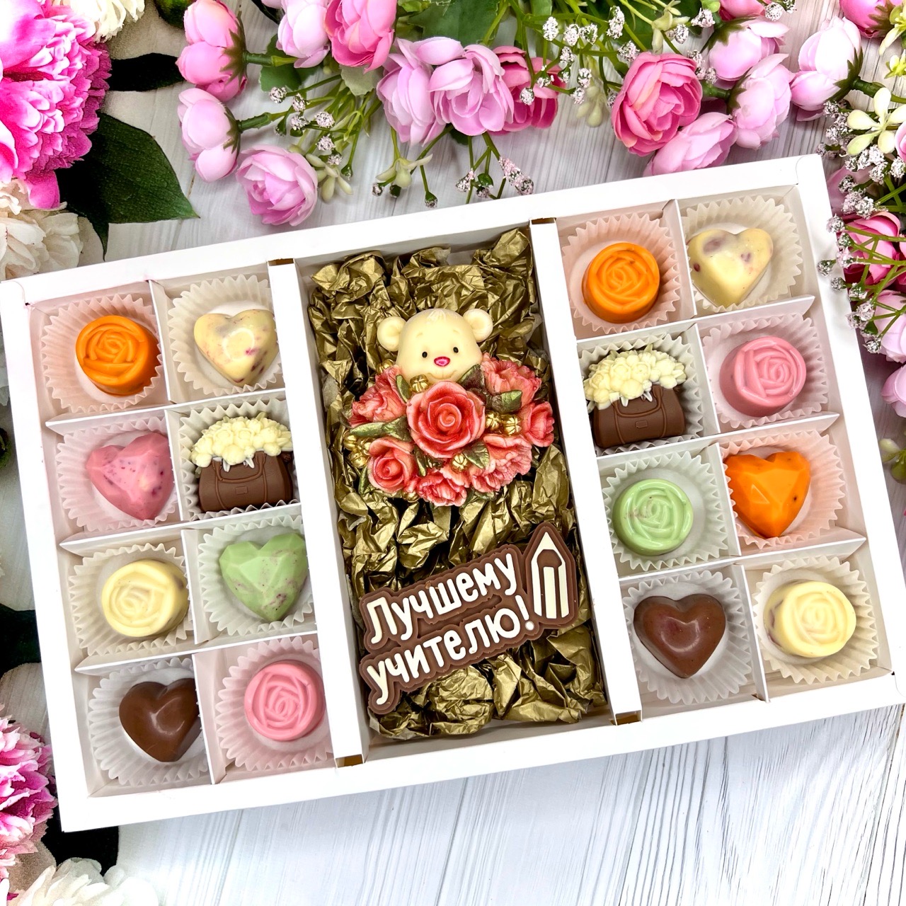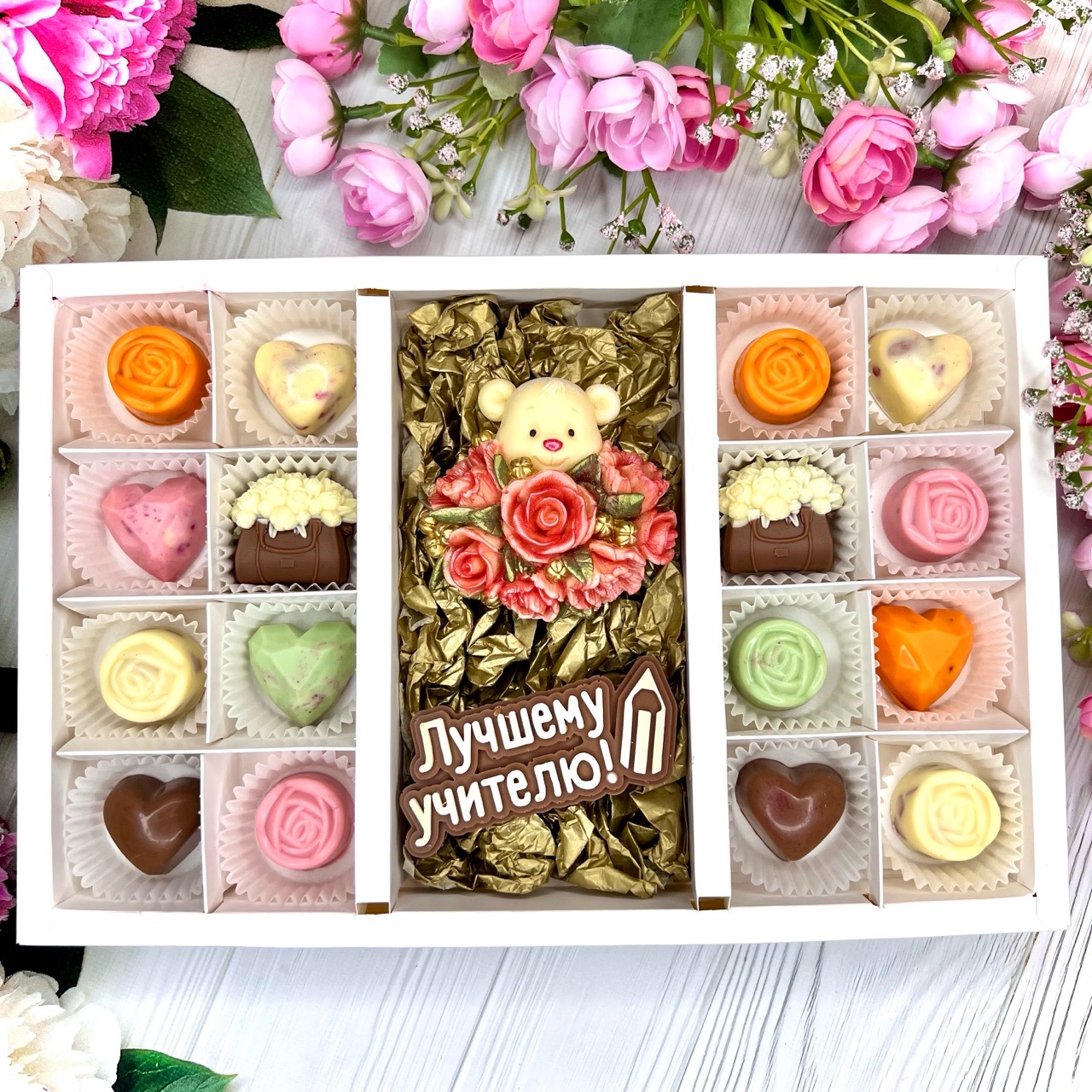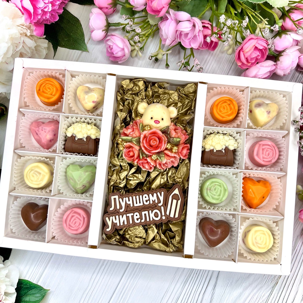 Шоколадный набор "Лучшему учителю. Мишка с розами": шоколадка-надпись и 16 конфет ручной работы - оригинальный, достойный и поистине вкусный подарок учителю из бельгийского шоколада.