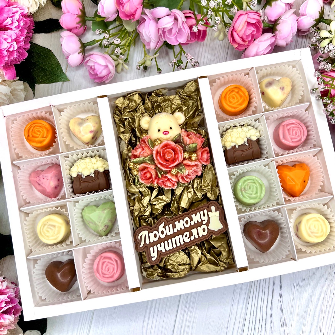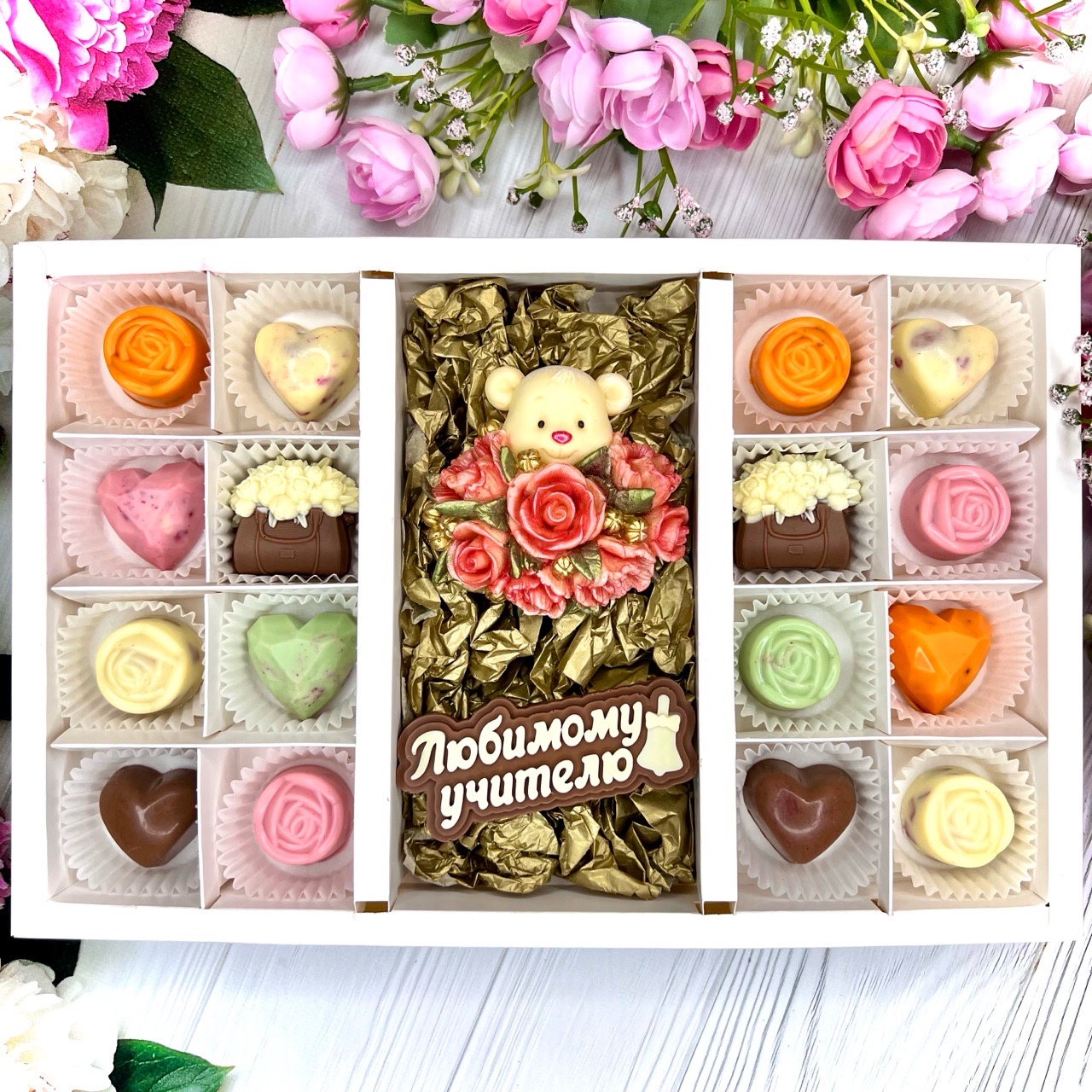 Шоколадный набор "Любимому учителю. Мишка с розами": шоколадка-надпись и 16 конфет ручной работы - оригинальный, достойный и поистине вкусный подарок учителю из бельгийского шоколада.