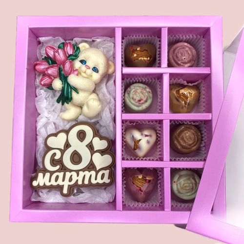 Шоколадный набор "Любимому учителю": Мишка с тюльпанами, шоколадка-надпись и 8 конфет ручной работы